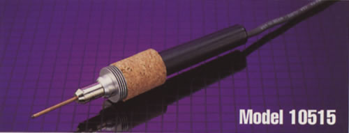 Uses: These Micro-Soldering Probe Handpieces were developed to introduce intense heat into small localized areas. This tiny Handpiece heats and cools very quickly (this is always an important asset when working on miniature components) and is used to heat and reflow 1/64” to 1/32” (.40mm to .80mm) pads or .001” to .01” (.025mm to .25mm) diameter micro-balls of solder onto miniature connections. This Handpiece can be adapted to many other uses where an extremely small heat source is required.