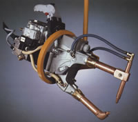 Models S-2151 / S-2152The S-2151 series funs are specifically designed as an economical means of joining light gauge sheet steel. They are extremely compact and also highly maneuverable on all three places of operation. Ideally suited for production line use, they have built in versatility for many custom applications. · Rated at 15KVA with 15,000 amps of secondary short circuit current. · Maximum electrode force of 560 lbs. at 85 P.S.I. and shortest throat depth. · Ball-race type gyroscopic suspension allows easy rotation. · Interchangeable standard arms provide throat depths of 6.29 in. through 19.68 in. · Gyro lock provides consistency in all planes of operation. · Trigger controlled retraction for extra electrode clearance to work stroke. · Designed for single spot or automatic repeat with appropriate controls. · Fully water cooled. · Epoxy-resin encapsulated transformer. · Standard cable length 50 ft. · Weight 72 lbs. with short arms. |