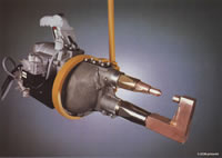Models S-2178 / S-3238 / S-3328These guns provide the identical features found in ARO scissors guns in a "C" type configuration. Designed to provide compact, versatile units for joining sheet steel. · S-2178 rated at 15,500 amps secondary short circuit current. · S-3238 rated at 18,000 amps secondary short circuit current. · S-3328 rated at 25,000 amps secondary short circuit current. · Ball-race type gyroscopic suspension allows easy rotation. · Control by insulated plug-in handle (two possible positions). · Trigger controlled retraction for extra electrode clearance to work stroke. · Designed for single spot or automatic repeat with appropriate controls. · Fully water cooled. · Epoxy-resin encapsulated transformer. · 50 foot cable length standard. |