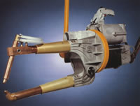 Models S-6421 / S-6422The S-6421 Series guns have outstanding ability for the welding of heavy duty sheet steel applications. They are easy to handle with movement on all three planes of operation. · Rated at 42KVA with 26,000 amps short circuit secondary current. · Interchangeable standard arms provide throat depths of 9.84" through 41.34". · Maximum electrode force of 1,210 lbs. at 72 P.S.I. and shortest throat depth. · Able to weld two pieces of 6 ga. mild steel together with 9.84" throat depth. · Suitable for use with full range of standard and special controls. · Trigger controlled retraction for extra electrode clearance with automatic return to working stroke. · Compact ball-race type gyroscopic suspension system for excellent maneuverability in three planes. · Fully water cooled. · Standard cable length 50 ft. · Weight 143 lbs. |