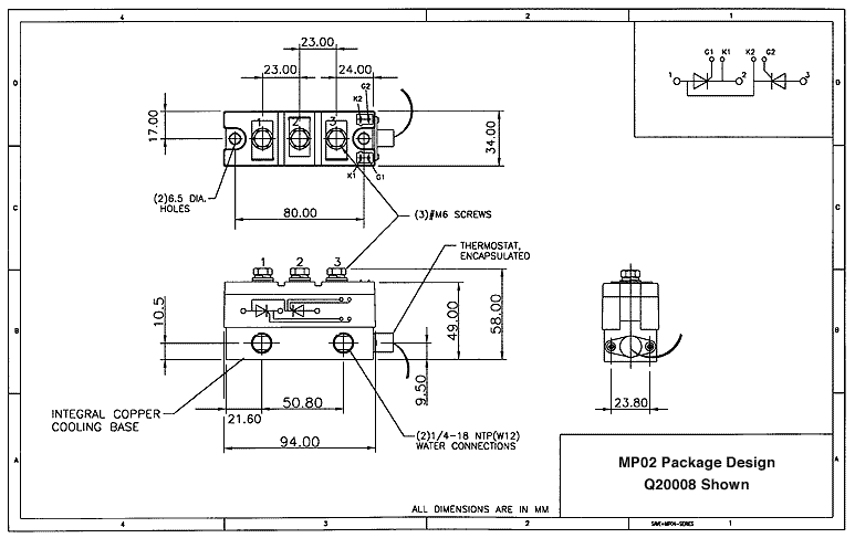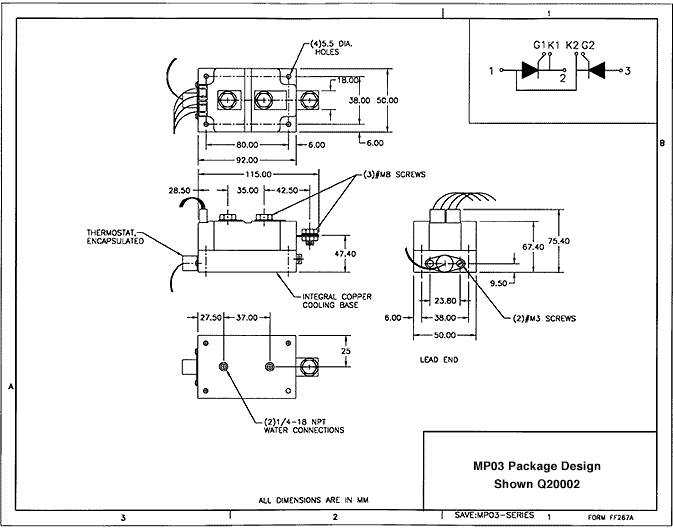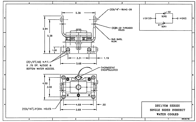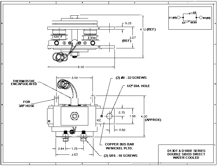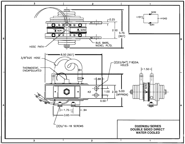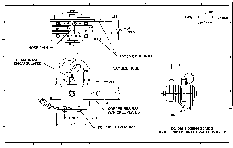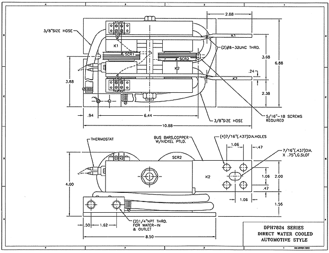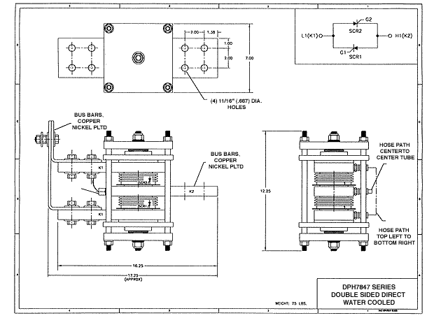 This product line features industry standard dual SCR modules with integral water cooled bases. Our improved design has eliminated thermal barriers associated with separate cooling bases. This has increased current ratings by as much as 15%. In addition, because the water connections are directly tapped to the module base, water leaks are virtually eliminated. To further enhance water integrity, each unit is 100% pressure tested at 150 psi for one minute.