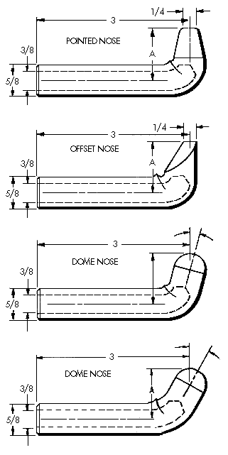 Tips are made in one and two-piece designs. The one-piece tips are offered with the nose designs shown. The two-piece tips are made up by combining the shanks shown here with Tuffcap caps (normally used with No. 5 RW size Tuffcap shanks). Either male or female tips can be used, with any nose design offered (CLICK HERE). All integral tips and shanks shown here are of Class 2 alloy.